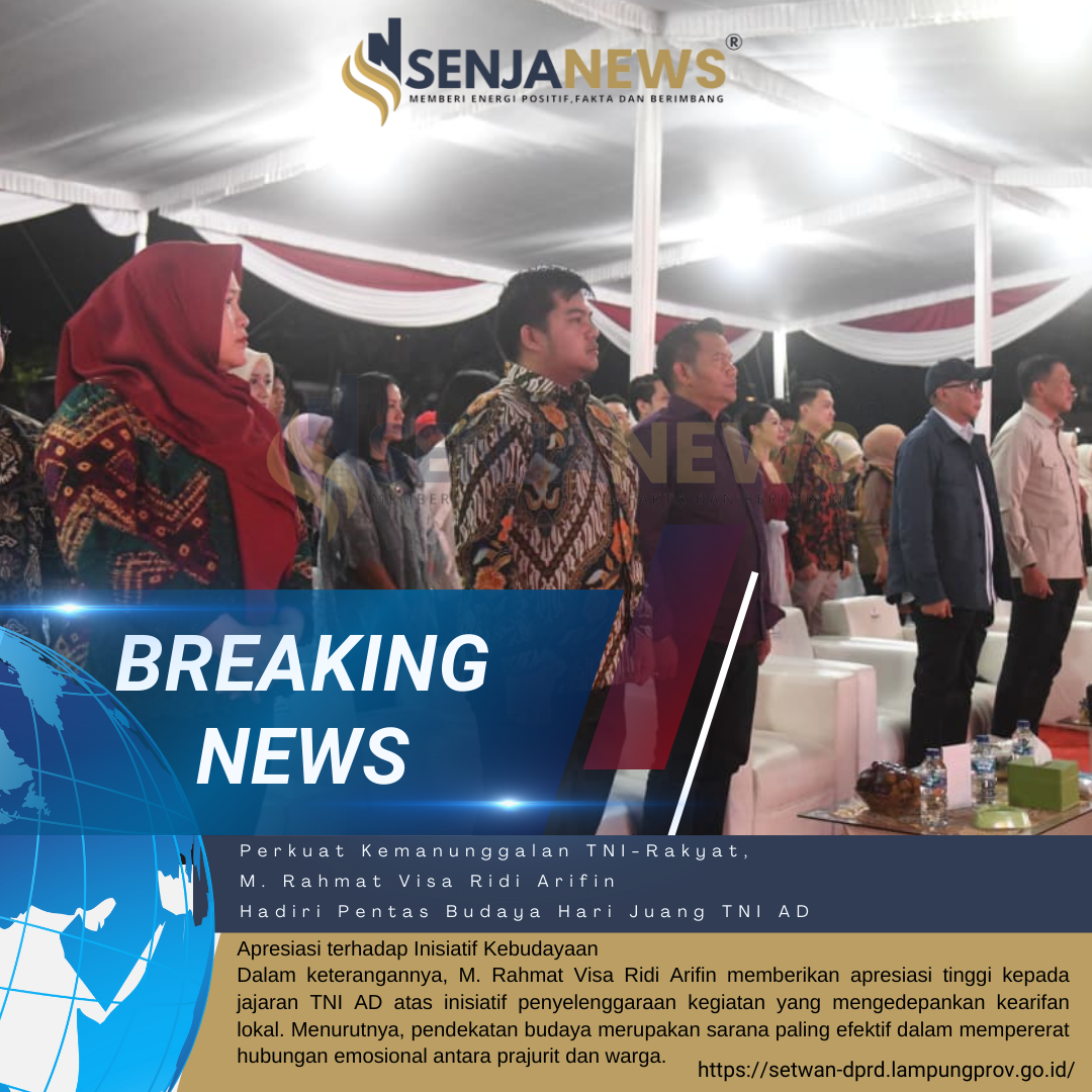 BANDAR LAMPUNG – Anggota DPRD Provinsi Lampung, M. Rahmat Visa Ridi Arifin, menghadiri perhelatan akbar Pentas Seni dan Budaya yang diselenggarakan oleh Korem 043/Gatam (Kodam II/Sriwijaya) dalam rangka memperingati Hari Juang TNI Angkatan Darat. Acara yang berlangsung meriah tersebut dipusatkan di Lapangan Saburai, Enggal, Bandar Lampung, pada Sabtu malam.